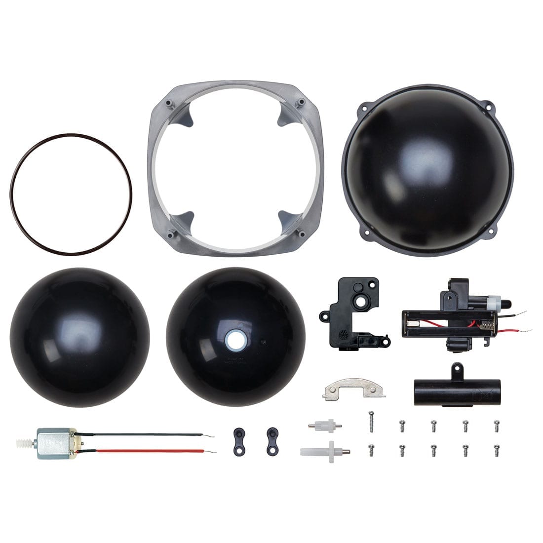 • חצי כדור (עם חור למתג) וחצי כדור (ללא חור), מנוע עם חוטי חשמל, ברגים, טבעת מפלסטיק רך והוראות מפורטות.