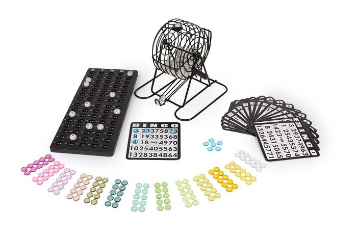 ערכה שלמה הכוללת: מתקן רשת מתכתי לערבוב כדורי הבינגו, 75 כדורים צבעוניים מסומנים, לוח סימון ראשי למנהל המשחק, ז'יטונים וכרטיסים לשחקנים עצמם