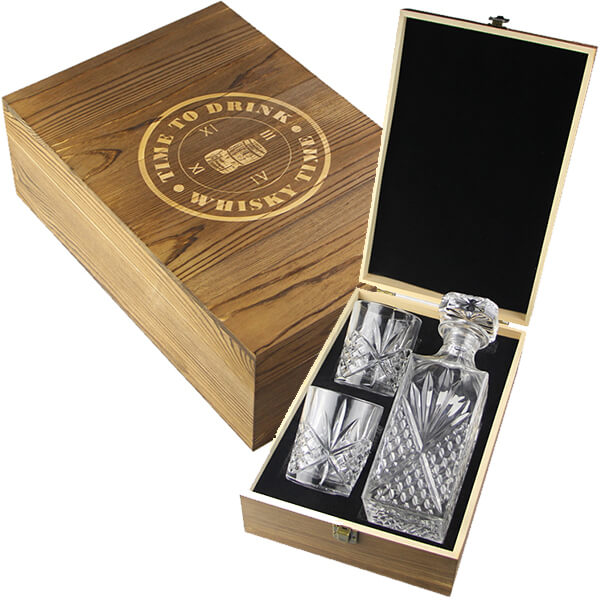 מארז 2 כוסות וויסקי ודקנטר בקופסת עץ מהודרת