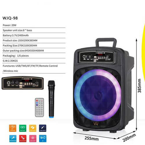 אוהבים מוזיקה בחיק הטבע? קריוקי? צריכים מערכת הגברה ניידת? עורכים מסיבה? עם הדגם החדש WJQ-98 תיהנו מעוצמה ואיכות צליל גבוהה ממש בכל מסגרת: בתחום ההדרכה וההפעלה, כמערכת הגברה לטיול או פיקניק, למסיבות יום-הולדת ועוד ועוד - פשוט ליהנות ממוזיקה והגברה עוצמתית בכל מקום!