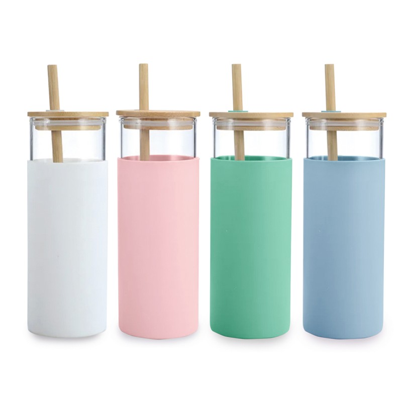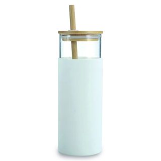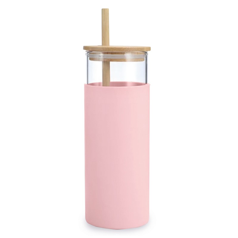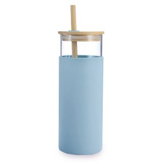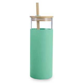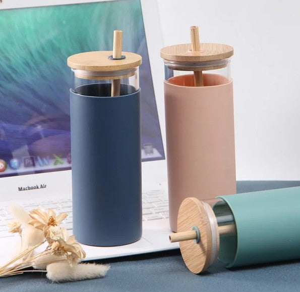 כוס זכוכית מעוצבת עם מכסה במבוק וקש