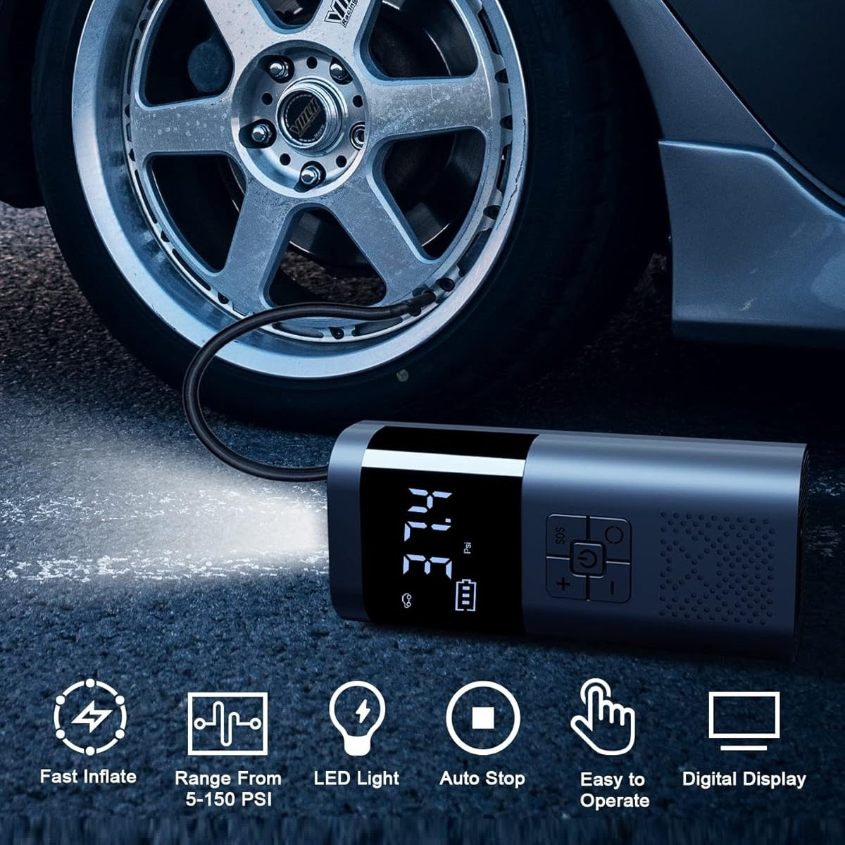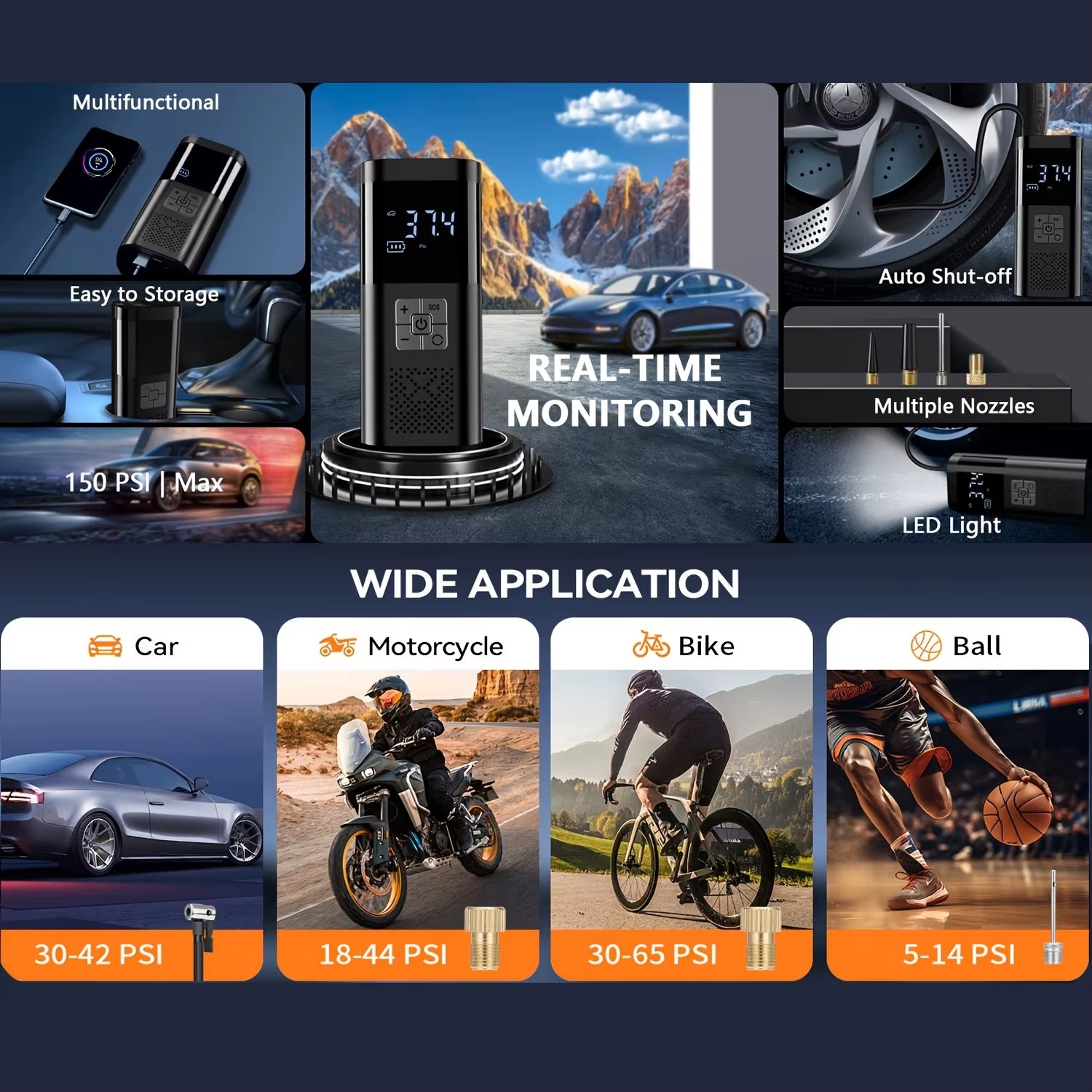 • טווח דחיסה של עד 150PSI להתאמות מדויקות של לחץ האוויר בצמיגים.