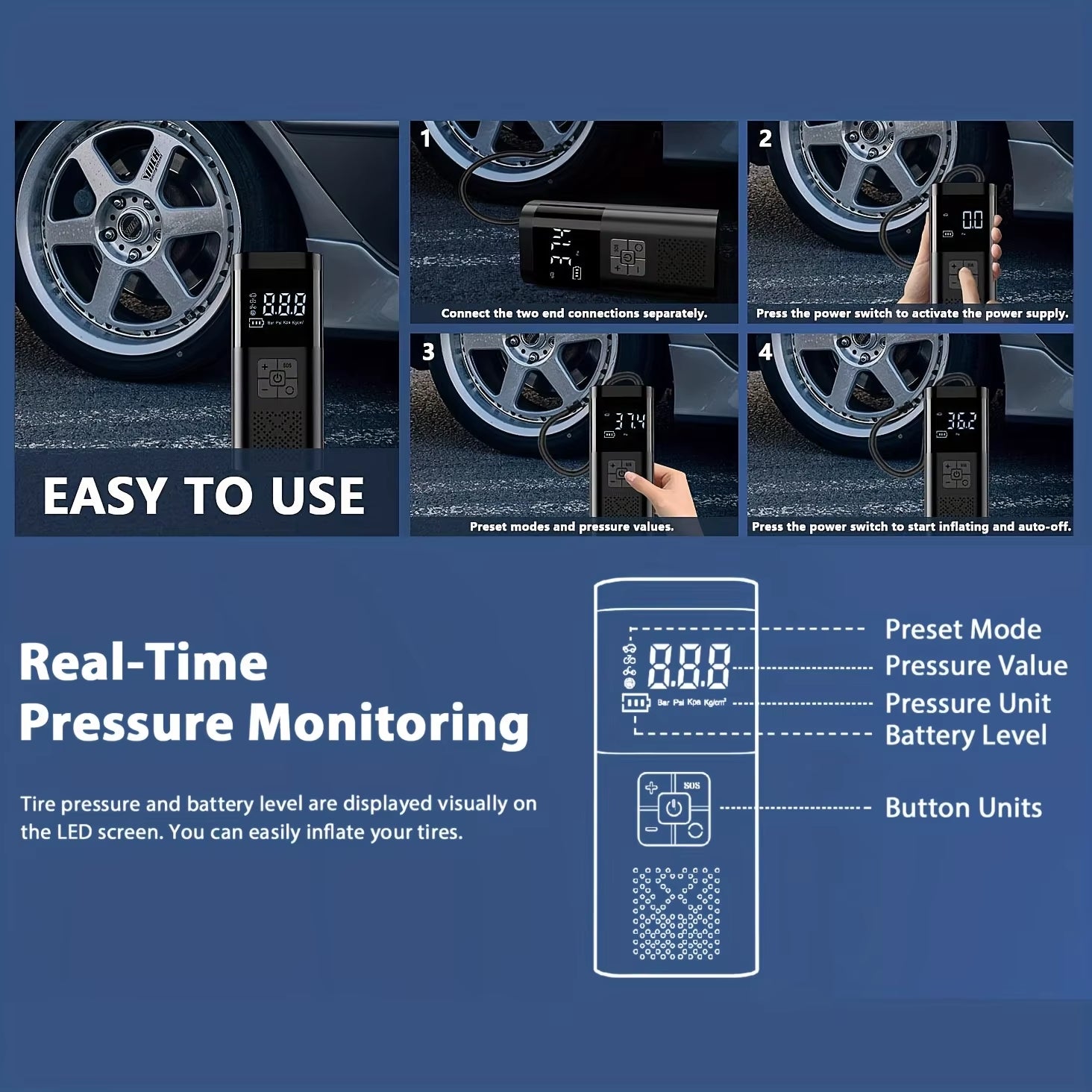 • המדחס אלחוטי הכולל צג דיגיטלי לחיווי מצב דחיסה PSI.