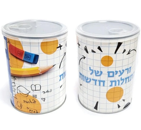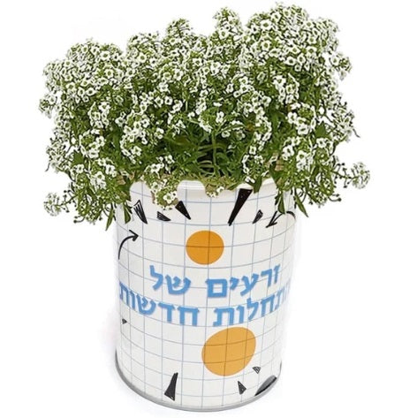 • צמח בפחית דגם "זרעים של התחלות חדשות" בעטיפה מעוצבת צבעונית ומקורית.
