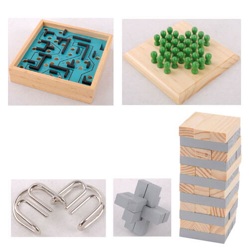 סט משחקי חשיבה איכותיים למשפחה ולבית, הכוללים מגוון רחב של משחק חשיבה: מחשבת, מבוך, מגדל עץ, קוביית פירוק, טבעות מתכת