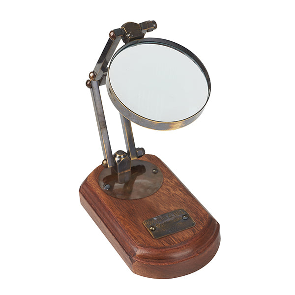זכוכית מגדלת בסגנון עתיק על זרוע נחושת מתקפלת ובסיס עץ