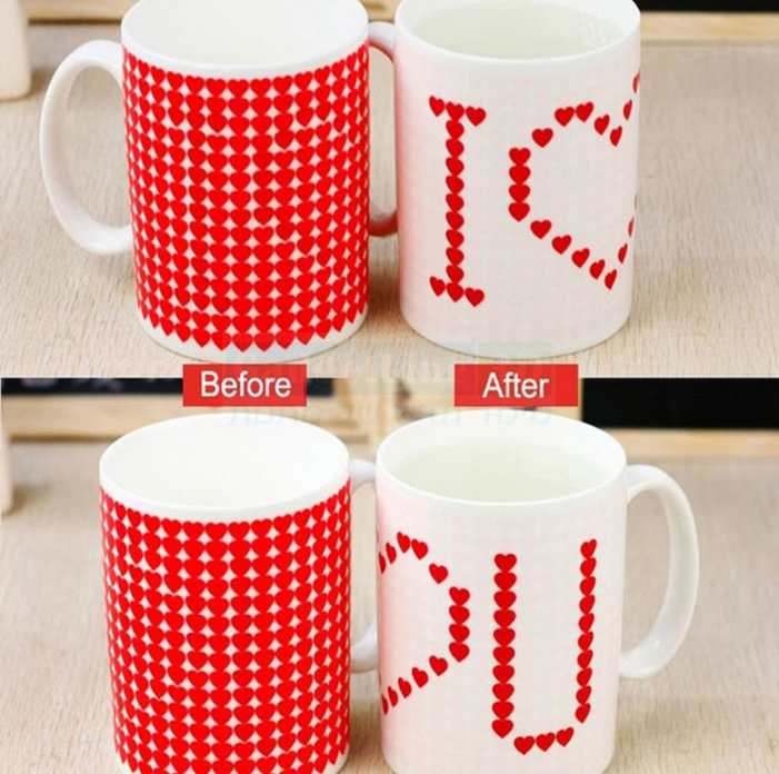 • כאשר הספל מכיל נוזל חם (קפה וכו') משתנה מראהו והלבבות האדומים בונים את המשפט - I love you (אני אוהב רותך)