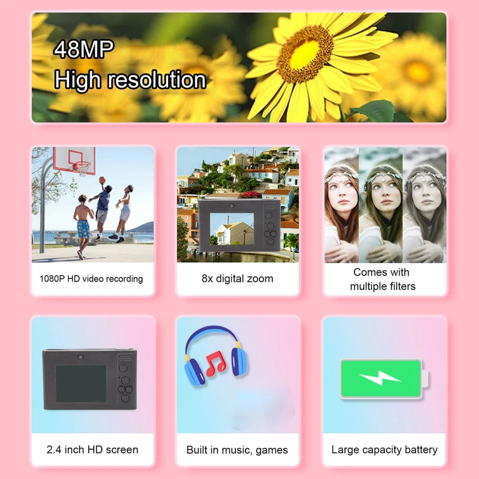 מחפשים מתנה כיפית לילד/ה? הכירו את המצלמה הדיגיטלית החדשה שלנו באיכות 48MP מגה פיקסל! המאפשרת צילום ברזולוציה גבוהה של תמונות נהדרות באיכות 48MP וסרטונים באיכות של 1080P - צילום תמונות ברורות במיוחד עם פרטים עשירים ושחזור צבעים מדויק, הכולל יכולת זום דיגיטלי עד כפול 8, מסך/צג LCD איכותי, נטענת בקלות ונוחה להפעלה. ללא ספק מתנה שכל ילד ישמח לקבל!