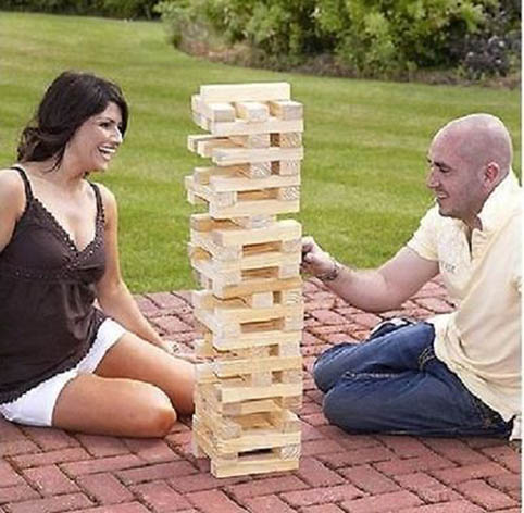 משחק ג'ינגה עם מלבני עץ ענקיים