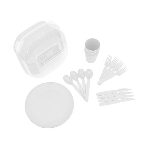• הסט כולל: 4 מזלגות, 4 כפיות, 4 סכינים, 4 צלחות, 4 כוסות וקופסת אחסון.