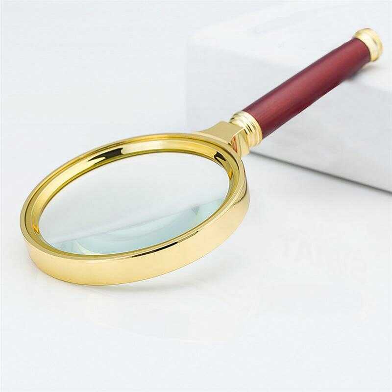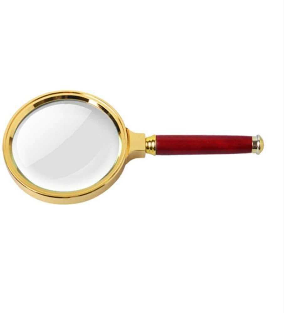• זכוכית מגדלת בצבע זהב וידית בצבע עץ