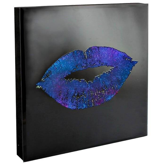 זוג השפתיים החושניות נראות כשהן זוהרות בצבעים מתחלפים על גבי משטח זכוכית בשחור מט
