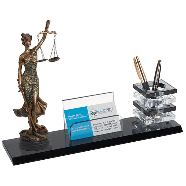• מעמד קריסטל "אלת הצדק" לכרטיסי ביקור עם כוס לעטים.