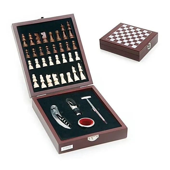 סט משחק שחמט מעץ משולב בכלים ואביזרי יין